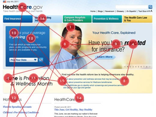 Bij deze methode volg je de oogbeweging van bezoekers die zich bevinden op je website. Uit deze oogbewegingen kun je zien waar je bezoekers het langst en vaakst naar kijken. Door de oogbewegingen te combineren kun je erachter komen of de bezoekers kijken naar de dingen die jij belangrijk vindt. Programma’s die helpen bij de uitvoering hiervan, zijn Feng-Gui en Attention Wizard.